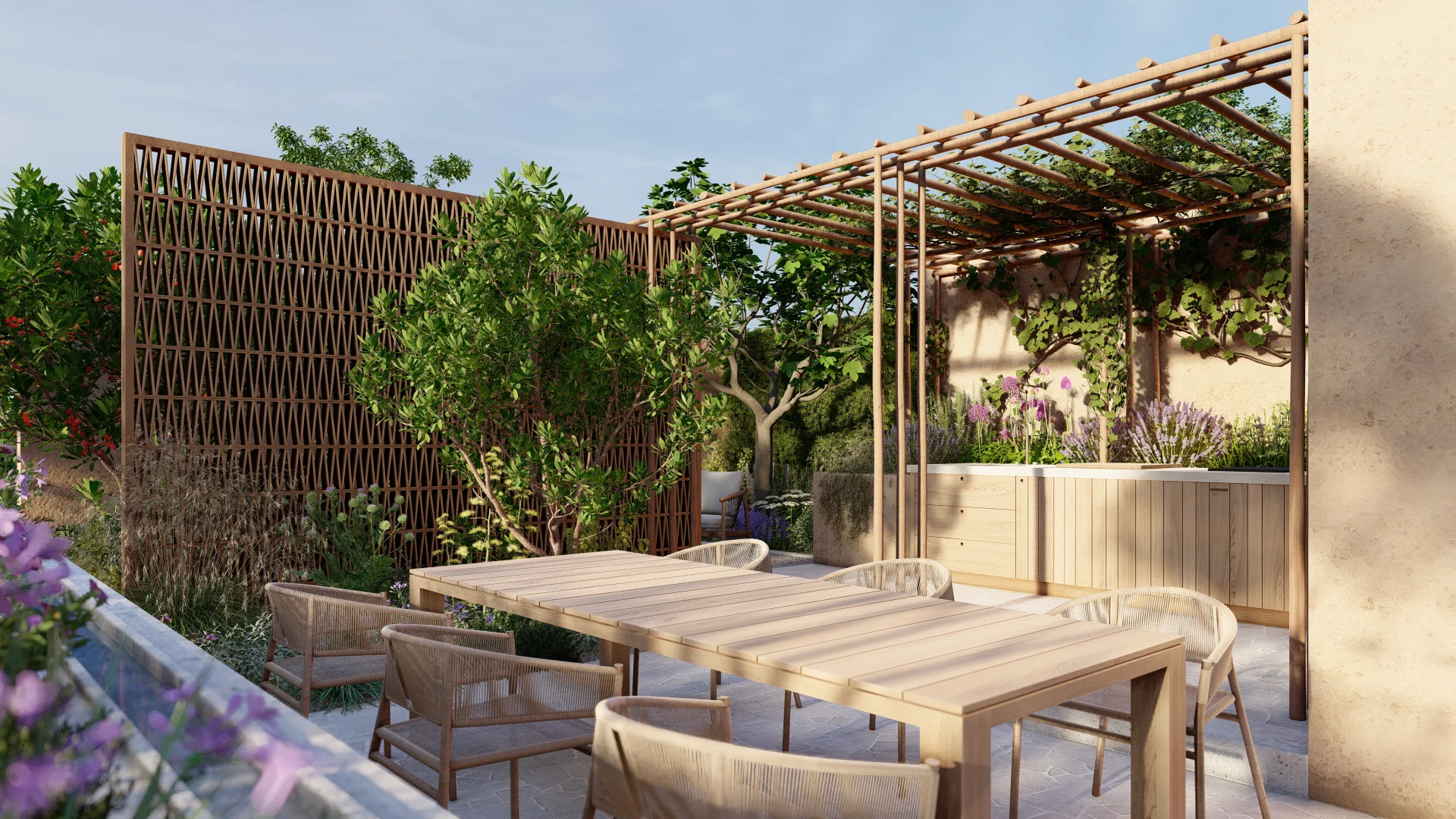 This design aims to showcase how a Mediterranean inspired garden can offer a compelling opportunity both for sustainable landscaping and attractive design to the ‘outdoor rooms’ of the South of England as much as the ones in Italy.