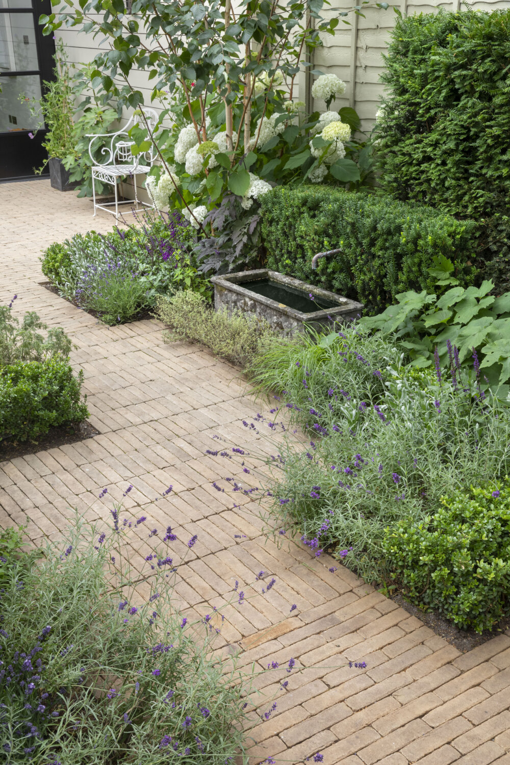 The construction phase involved thoughtful planning and execution to enhance the garden’s functionality and aesthetics. A contemporary screen fence was installed adjacent to the extension, and all garden boundaries were elegantly finished in a soothing Farrow and Ball shade referred to as ‘Bone’. For the surfacing, we selected handmade clay bricks crafted by Belgian brickworks, Vandemoortel, which were laid in a modern grid pattern to add both definition and visual interest to this compact outdoor space.