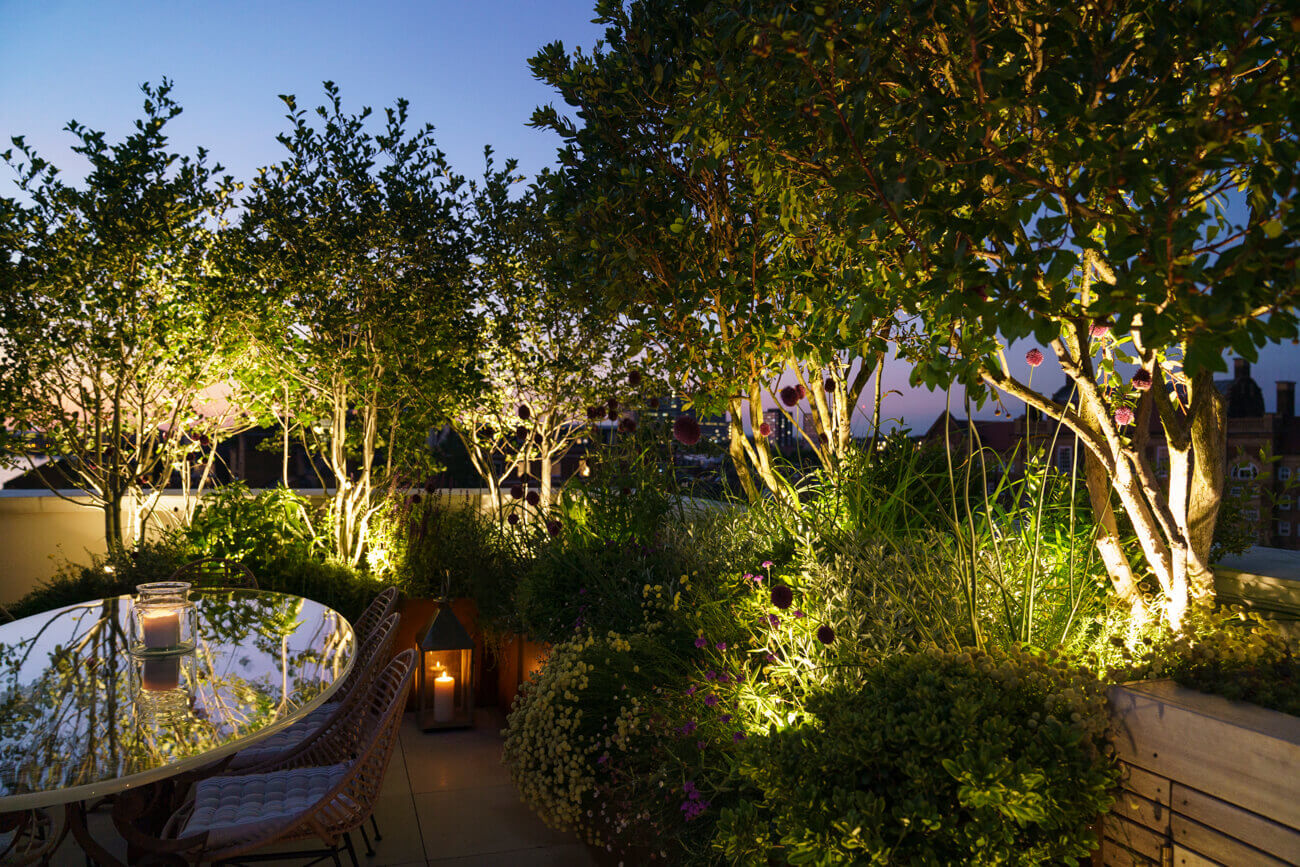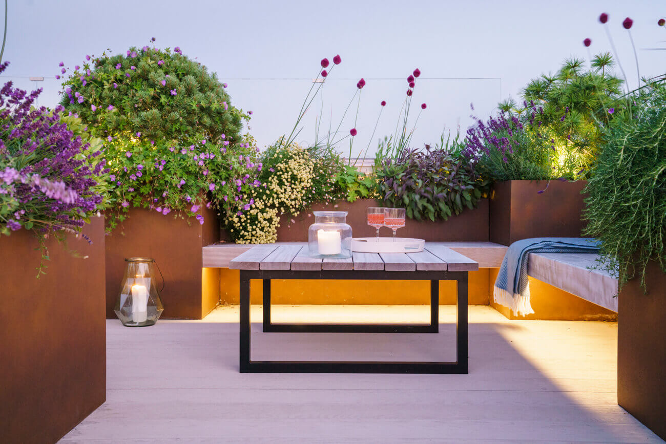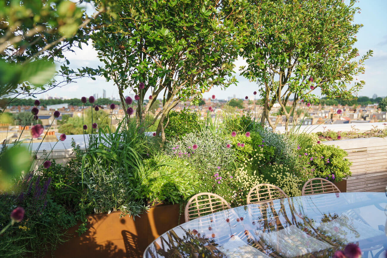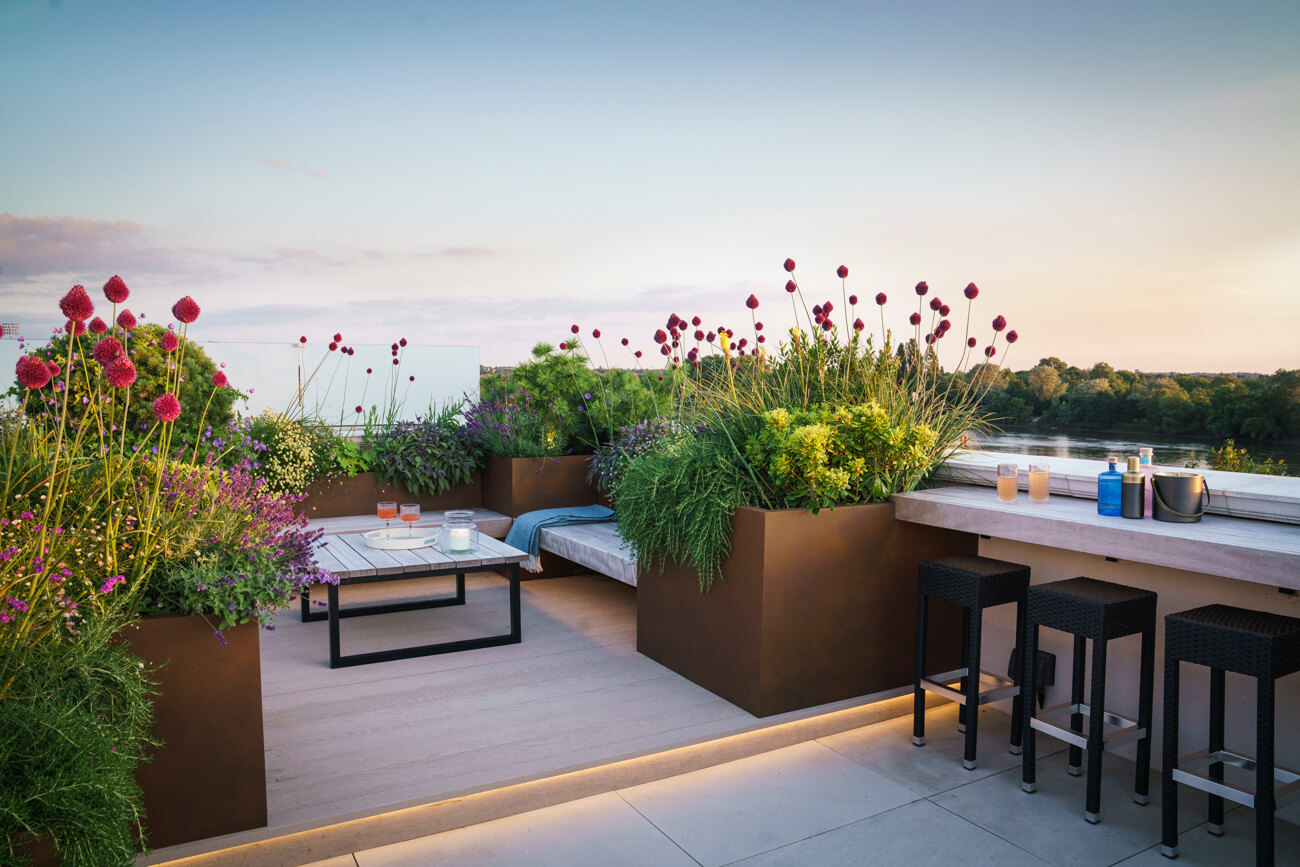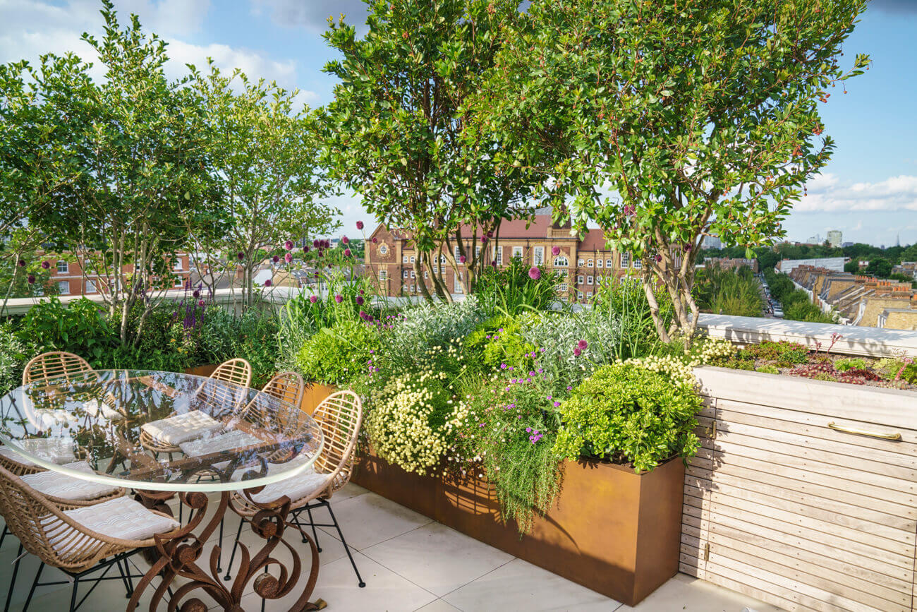To enhance the overall aesthetic, dramatic Corten steel-effect planters were incorporated, instantly adding warmth and character to the rooftop garden. The carefully curated spaces maintain a cohesive look and feel while providing varied atmospheres and functions, enhancing the usability and enjoyment of this stunning outdoor area as envisioned by our clients.